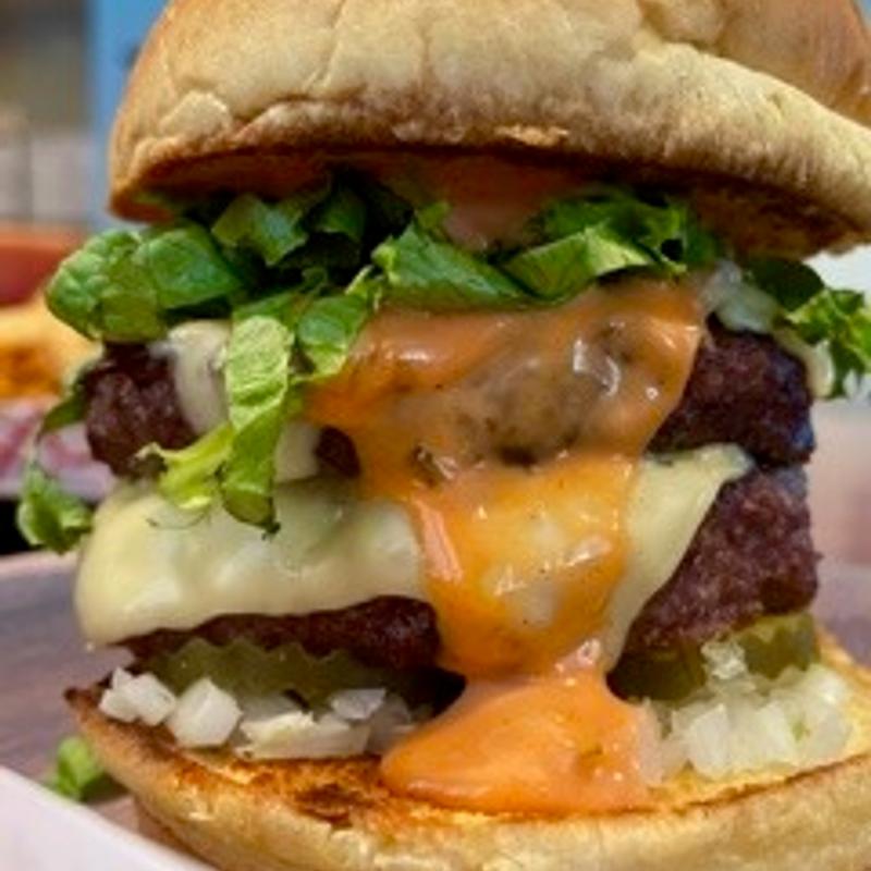 Two single burger patties, American cheese, shredded lettuce, chopped onions, pickles, 1000 island.