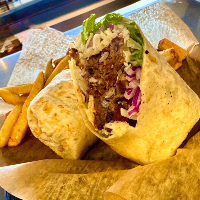 Black bean burger, Monterey Jack, lettuce, tomato, red onion, tomato jam, flour tortilla.