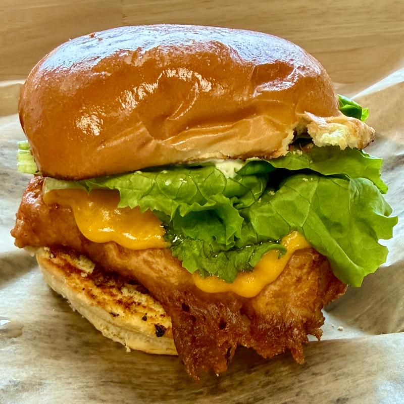 Fried cod filer, cheddar cheese, lettuce, house-made tartar sauce, brioche bun.