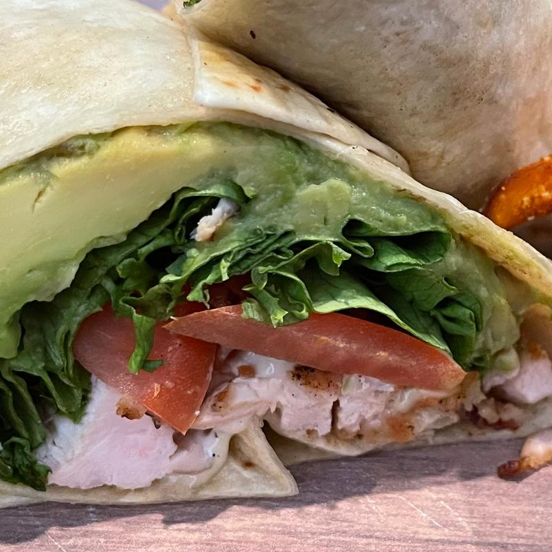 Grilled chicken, Monterey Jack, bacon, lettuce, tomato, avocado, garlic aioli, flour tortilla.