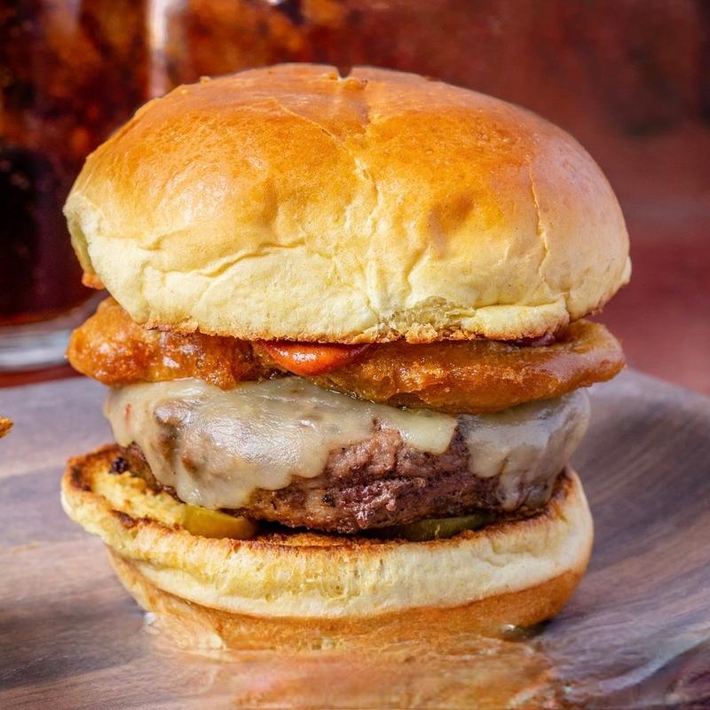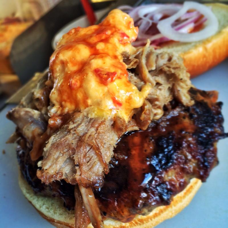 Burger, pulled pork, pimento cheese, BBQ sauce, red onion, pickles.