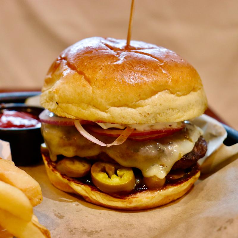 Our hand-pattied beef burger char-grilled and served on a bakery brioche bun • Gluten-friendly Bun available | Burgers come with a regular side item | Upgrade to a Premium Side