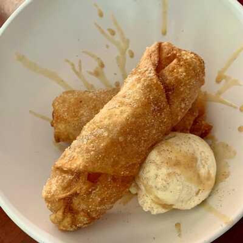 Apple pie filled egg rolls with vanilla ice cream and salted caramel drizzle.