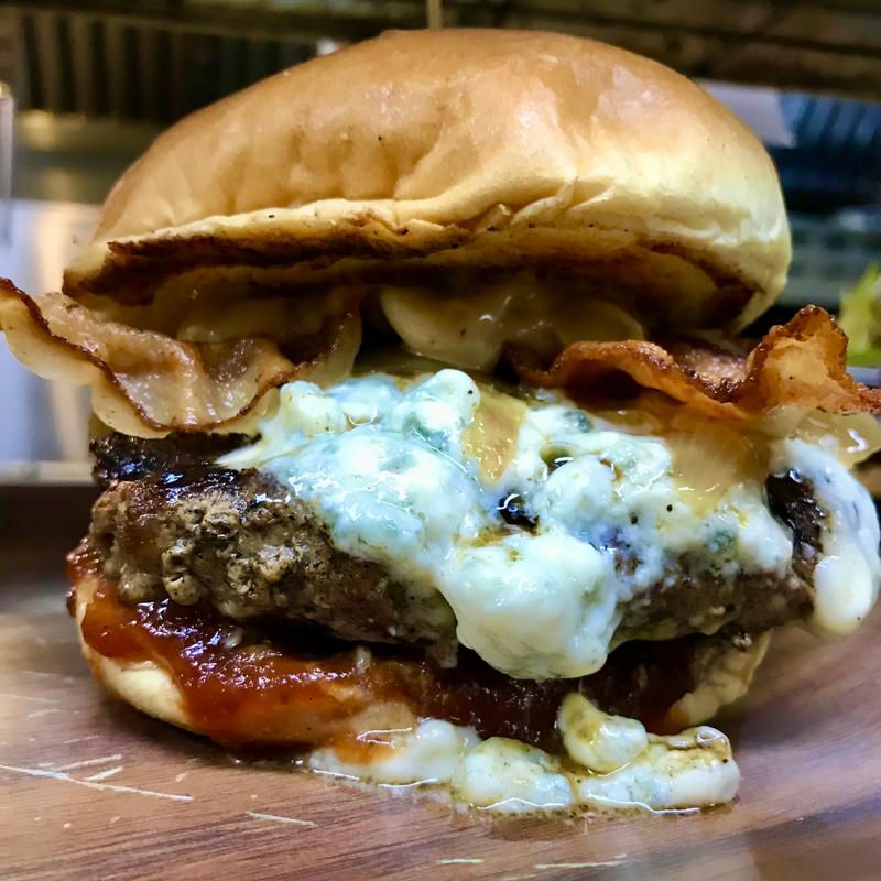 Bleu cheese crumbles, bacon, grilled onions, garlic aioli, PorterHouse steak sauce.