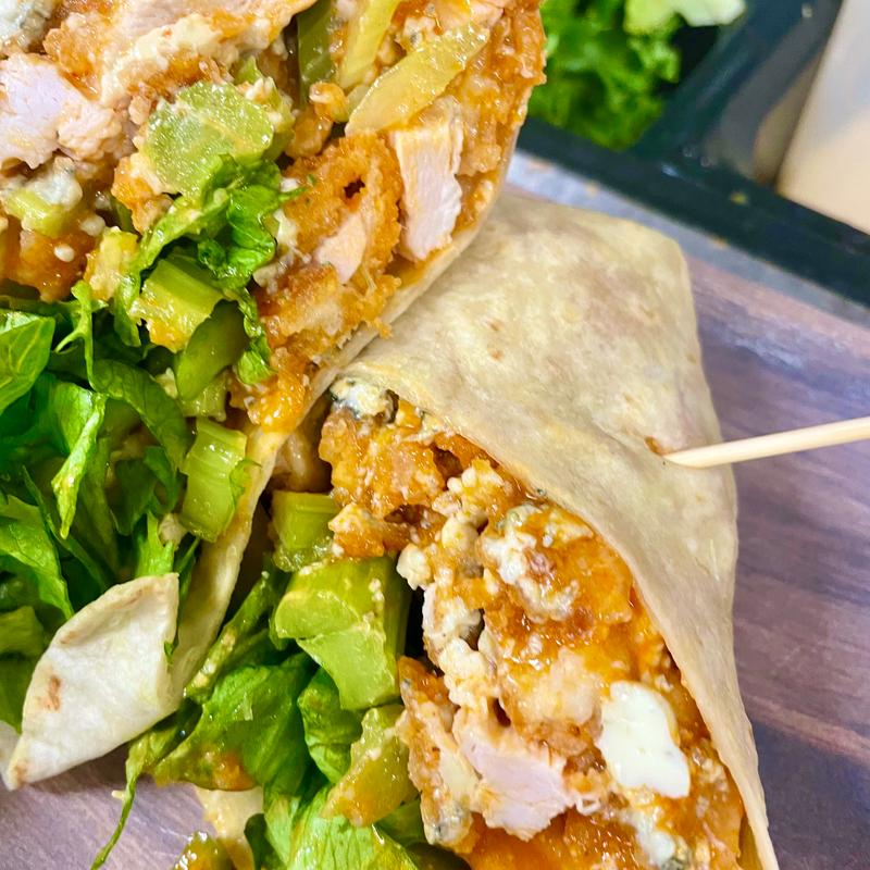 Fried chicken, bleu cheese crumbles, lettuce, celery, buffalo sauce, flour tortilla.
