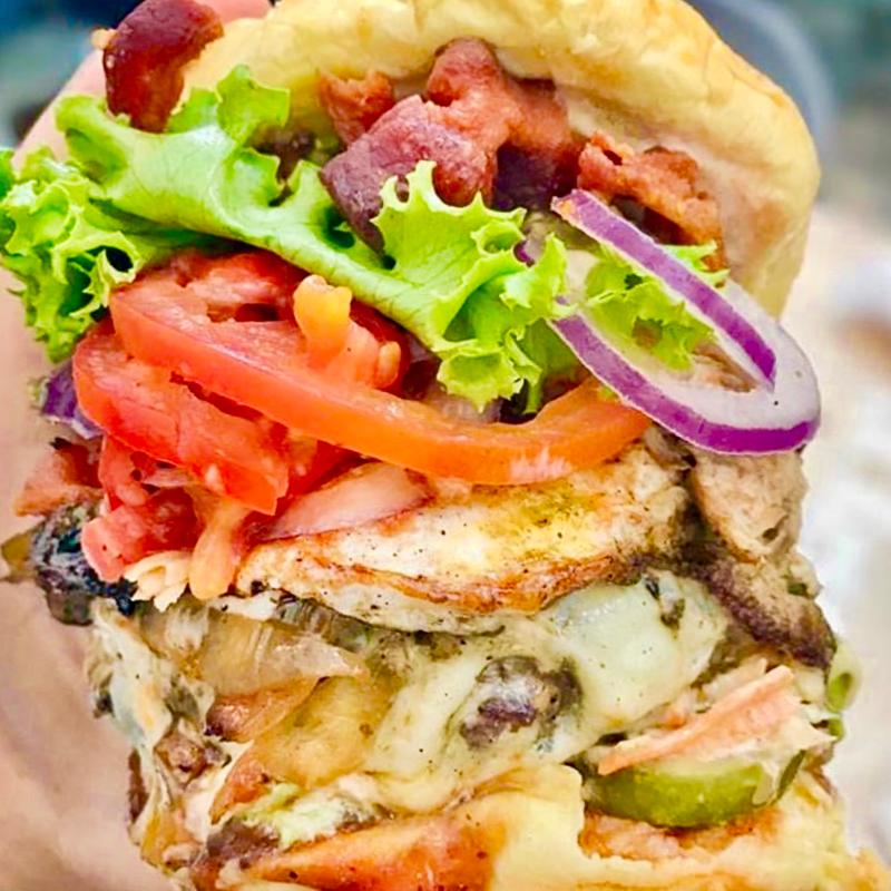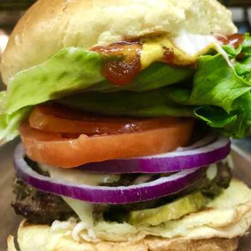 Burger topped with almost everything! Need we say more?