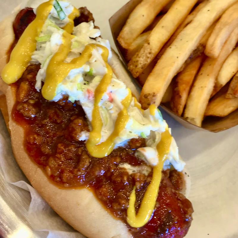 Quarter pound all beef hot dog, PorterHouse chili, coleslaw, onions, mustard, regular side.