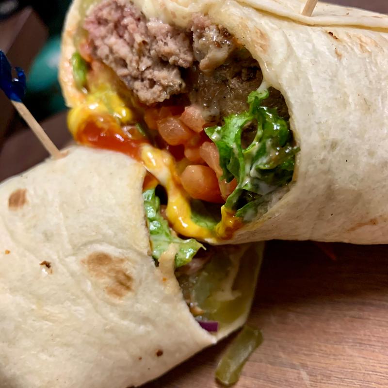 Burger, cheddar cheese, bacon, lettuce, tomato, pickles, jalapeno coleslaw, bacon mayo wrapped in a flour burrito.