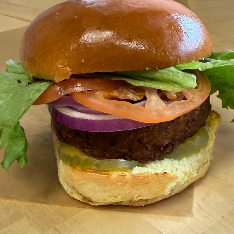 Plant-based burger that has all the juicy, meaty deliciousness of a traditional burger with lettuce, tomato, red onion, and pickles.
