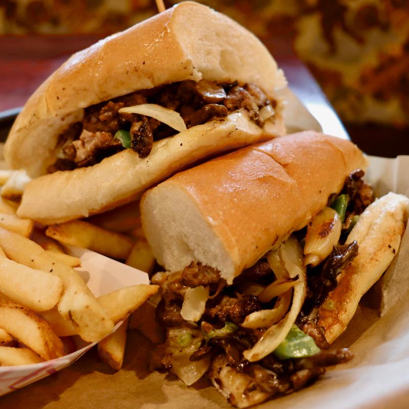Chopped burger, white American cheese, grilled green peppers, onions & mushrooms, garlic aioli, hoagie roll.
