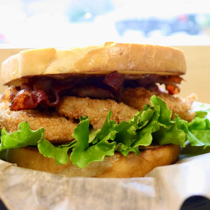 Fried green tomato, bacon, lettuce, garlic aioli, grilled sourdough.